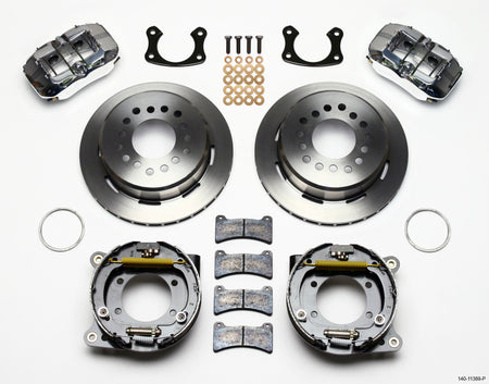 Forged Dynapro Low-Profile Pro-Series rear disc brake kits provide a complete solution for popular muscle car rear axles on applications that require a parking brake assembly and extra clearance for 14.00” to 15.00” rim applications. Forged billet Dynapro Low-Profile four-piston calipers 11.00” one-piece hat and rotor assemblies, and high friction pads provide optimized and balanced braking for all types of custom performance street/strip and show machines. The neatly hidden internal shoe system provides a clean installation with superior static holding power for parking. Optional caliper finishes and rotor designs enable the builder to personalize the style and optimize brake performance for every individual application.