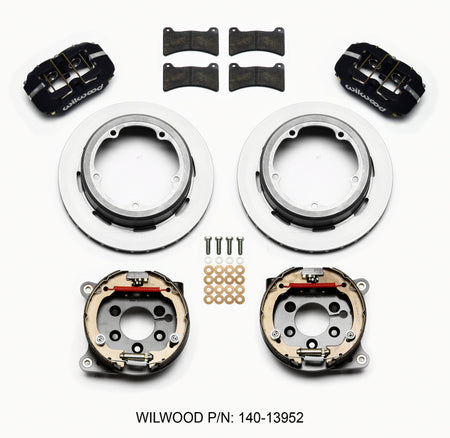 Forged Dynapro Low-Profile Pro-Series rear disc brake kits provide a complete solution for popular muscle car rear axles on applications that require a parking brake assembly and extra clearance for 14.00” to 15.00” rim applications. Forged billet Dynapro Low-Profile four-piston calipers 11.00” one-piece hat and rotor assemblies, and high friction pads provide optimized and balanced braking for all types of custom performance street/strip and show machines. The neatly hidden internal shoe system provides a clean installation with superior static holding power for parking. Optional caliper finishes and rotor designs enable the builder to personalize the style and optimize brake performance for every individual application.