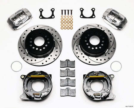 This group of FDL Pro-Series rear disc kits provides a complete solution for popular muscle car rear axles that require a parking brake. Forged billet Dynalite four piston calipers, 12.19” one-piece drum/rotors, and high friction pads provide optimized and balanced braking for all types of custom performance street/strip and show machines. The neatly hidden internal shoe system provides a clean installation with superior static holding power for parking. Optional caliper finishes and rotor designs enable the builder to personalize the style and optimize brake performance for every individual application.